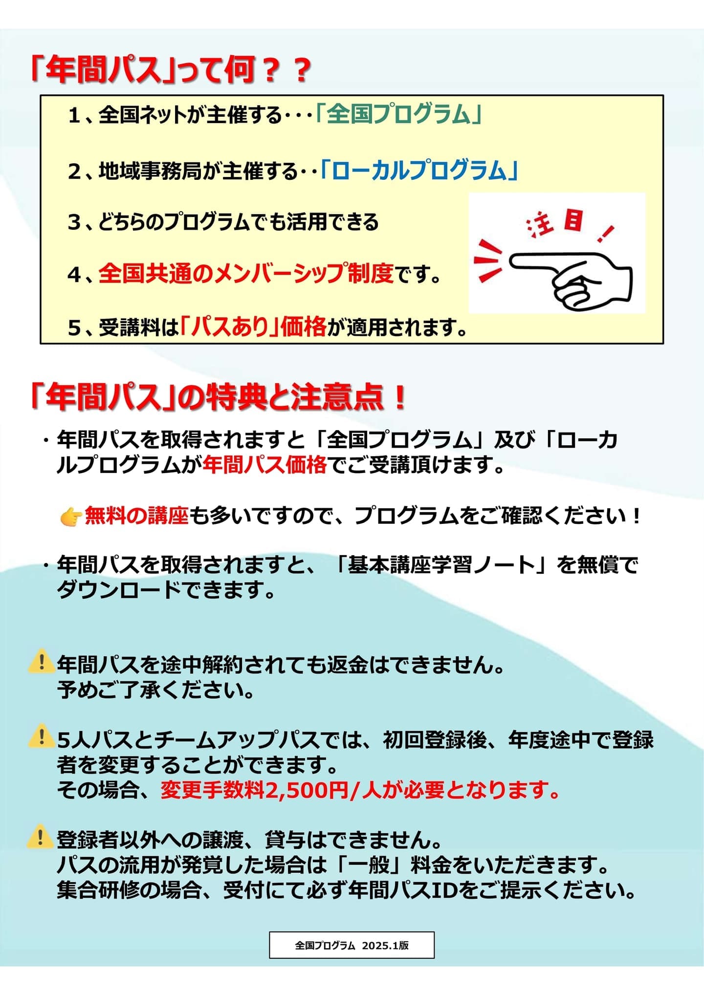 ◇年間パスは、自閉症eサービス全国ネットが提供する「全国プログラム」、及び地域事務局で開催される「ローカルプログラム」に利用できる、全国共通のメンバーシップ制度で、原則、受講料は割引の「パスあり」価格が適用できます。